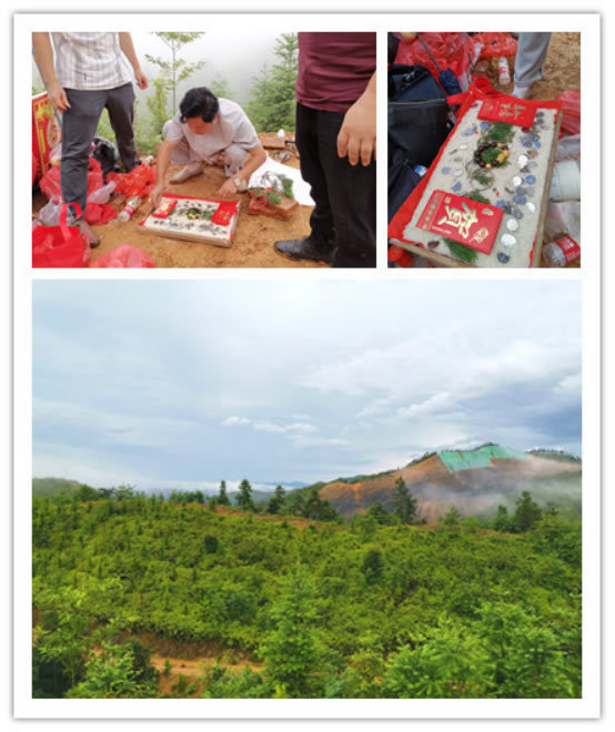 橙园附近一片大公墓为村里新设的墓园,墓园名堂开豁,四面环山,左右环保,风水不错,谢师父经过考察为客户点出了此处风水最好的几个位置,供客户选择。
